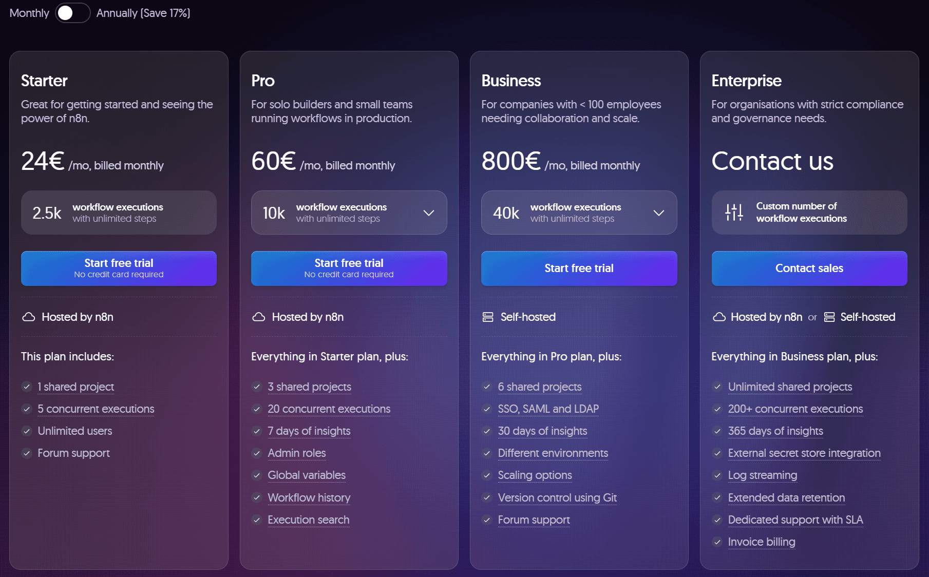 The cloud version of n8n. You sign up, pay a monthly subscription and that’s it. Zero installation, zero maintenance. Perfect if you want to get started right away, but it has limitations in the free plan and your data is on third party servers. Problem? maybe the price? n8n prices 2025