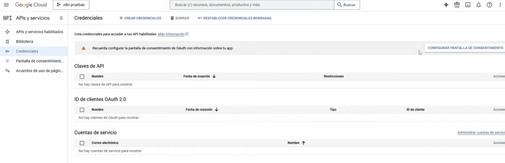 5. We go back to APIs/credentials and create an OAuth client. There the most important thing is to give permissions and in “URL of authorized redirects” we will put the URL that n8n gives us. Connect n8n with Google Docs