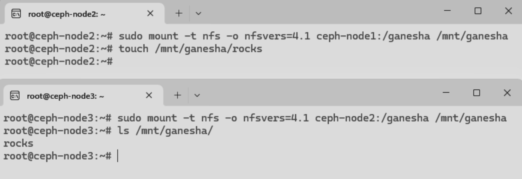 Let’s say we have a cluster with 3 ganesha-ready nodes, that means we can successfully export the underlying ceph fs from node 1 to node 2 and from node 2 to node 3, or whichever way we want !
