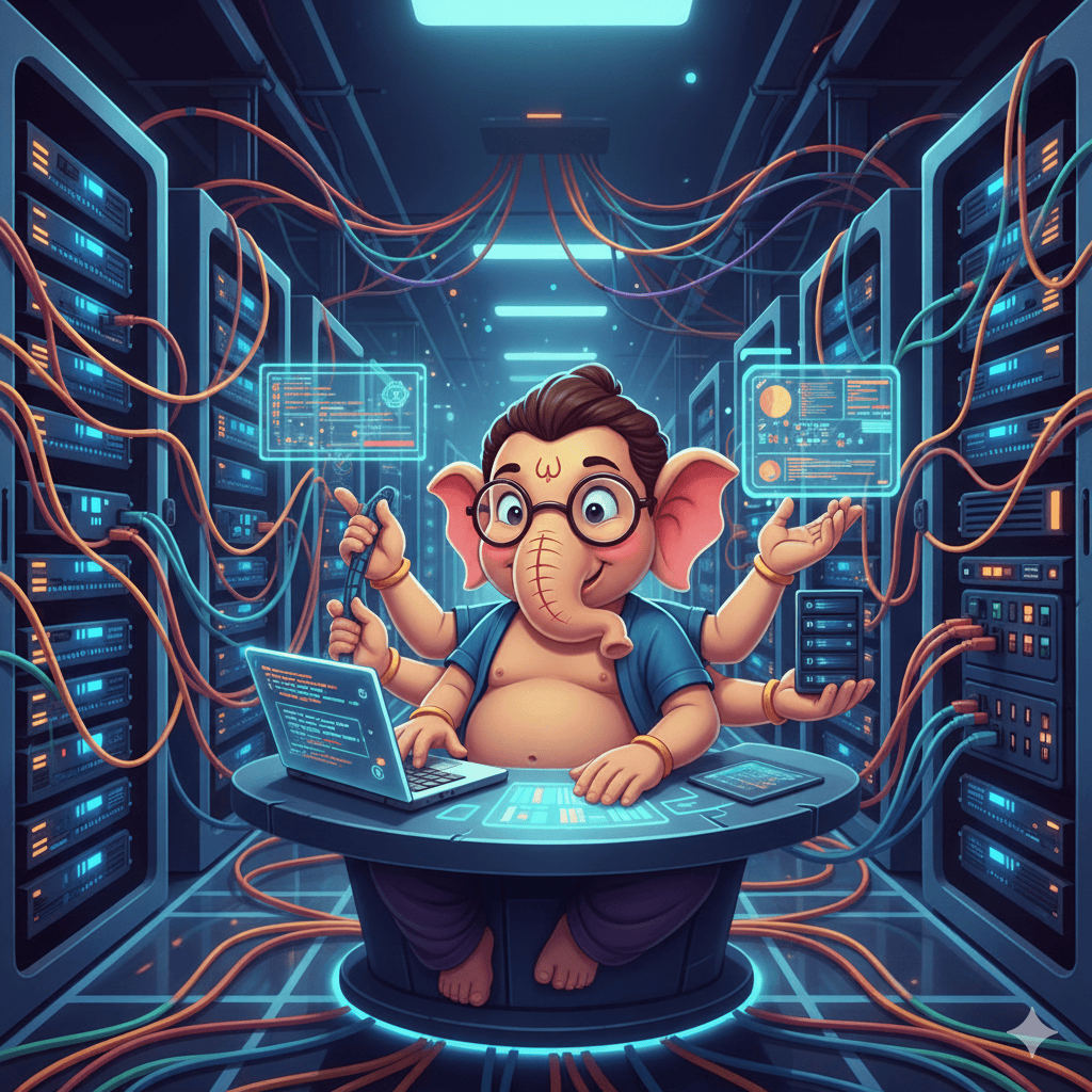 A modern data center filled with glowing Ceph storage nodes connected in a resilient cluster. In the center, a friendly cartoon-style Ganesha deity sits at a console with multiple arms managing NFS exports, cables, and servers. One hand holds a network cable, another a laptop, another a glowing Ceph logo, symbolizing high availability and orchestration.